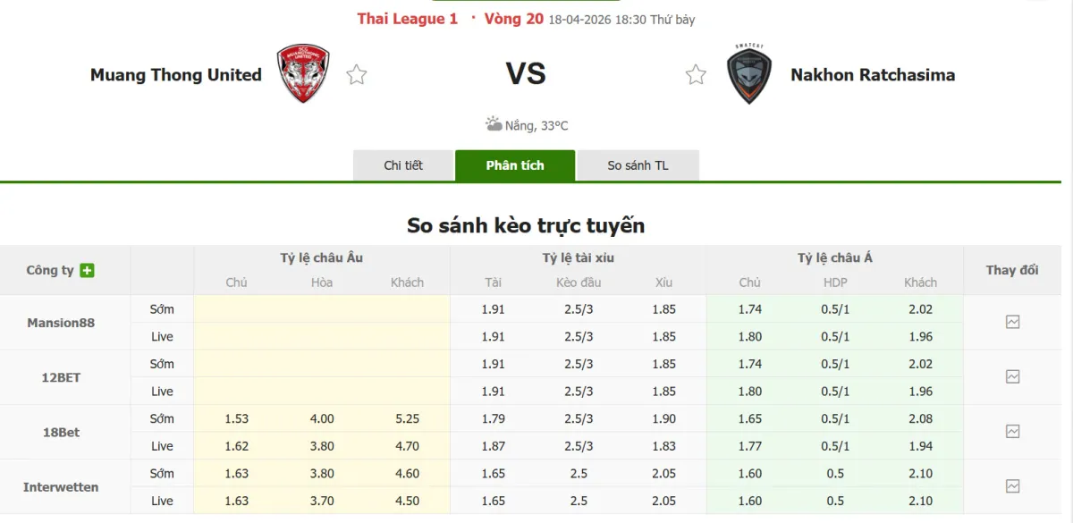 Phân tích và dự đoán kết quả trận đấu giữa Muangthong United và Nakhon Ratchasima sẽ diễn ra vào lúc 18h30 ngày 18 tháng 4 trong khuôn khổ giải VĐQG Thái Lan. Các chuyên gia hàng đầu sẽ cung cấp cái nhìn sâu sắc về tỷ lệ kèo châu Âu và châu Á cho cuộc đối đầu này.