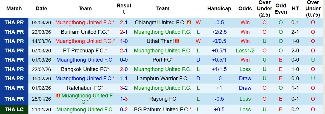 Thống kê phong độ 10 trận đấu gần nhất của Muangthong United