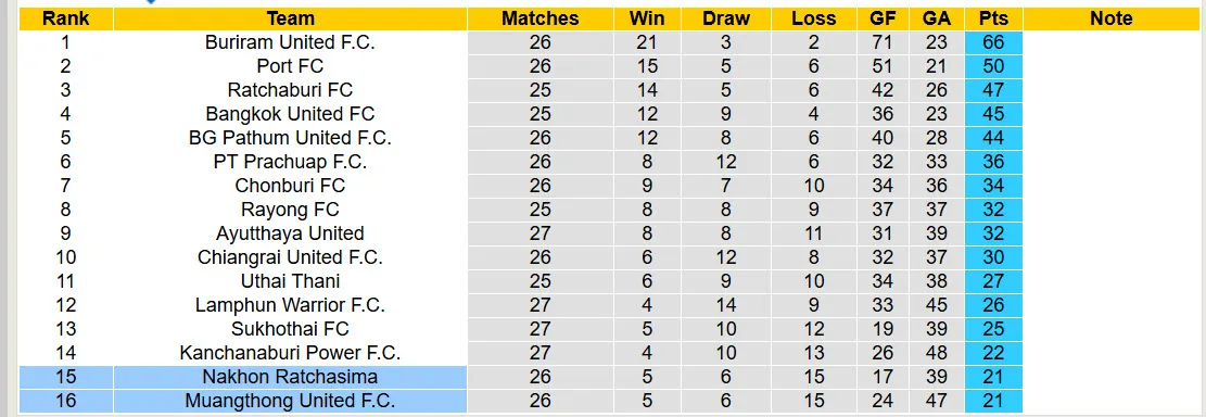 Trận đấu giữa Muangthong United và Nakhon Ratchasima được coi là tâm điểm của vòng 20 giải VĐQG Thái Lan khi cả hai đội đều đang đứng ở vị trí cuối bảng. Cụ thể, họ đều có 21 điểm sau 20 trận đấu và được xem là những ứng viên hàng đầu cho suất xuống hạng. Trong bối cảnh này, Muangthong United và Nakhon Ratchasima hiểu rõ rằng họ phải giành chiến thắng trong cuộc đối đầu trực tiếp này để duy trì hy vọng trụ hạng. Hiện tại, cả hai đội chỉ kém đội an toàn 4 điểm và đang thi đấu ít hơn 1 trận. Vì vậy, 3 điểm trong trận đấu đêm nay sẽ giúp mở ra cơ hội trụ hạng cho họ.