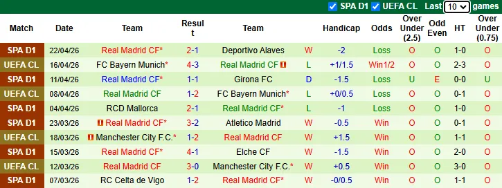 Thống kê phong độ 10 trận gần nhất của Real Madrid