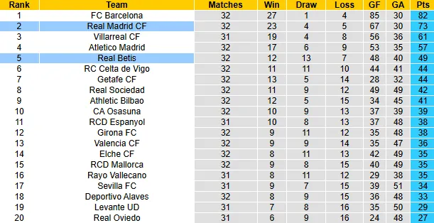 Thống kê phong độ, lịch sử đối đầu Real Betis vs Real Madrid