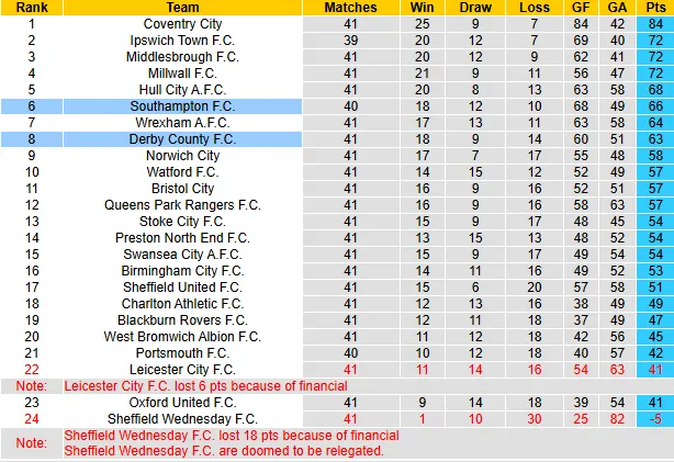 Mặc dù Derby rất kiên cường nhưng việc thiếu vắng ngòi nổ Agyemang sẽ khiến những pha phản công của họ mất đi sự sắc bén. Tại sân St Mary's, việc ngăn chặn Southampton lúc này dường như là một nhiệm vụ bất khả thi đối với các đội bóng tầm trung.