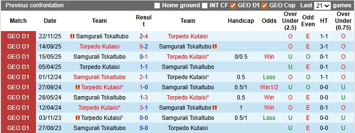 Lịch sử đối đầu giữa Torpedo Kutaisi và Samgurali Tskaltubo