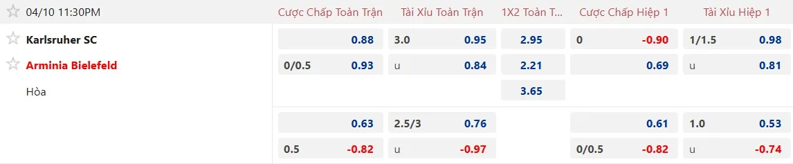 Mặc dù phải thi đấu trên sân khách và đứng thấp hơn trên bảng xếp hạng, nhưng Bielefeld lại được nhà cái đánh giá cao hơn, khi tỷ lệ họ chấp chủ nhà Karlsruher là 1/4 trái. Đây là lần đầu tiên trong lịch sử xảy ra trường hợp này, cho thấy sự tin tưởng của nhà cái vào Bielefeld, đặc biệt khi đội bóng này đã thắng kèo 2 trận gần nhất trên mọi đấu trường và đều chấp 1/4 trái. Trong khi đó, Karlsruher đã thua kèo 3 và chỉ thắng 1 trong 4 trận gần đây được chấp 1/4 trái.