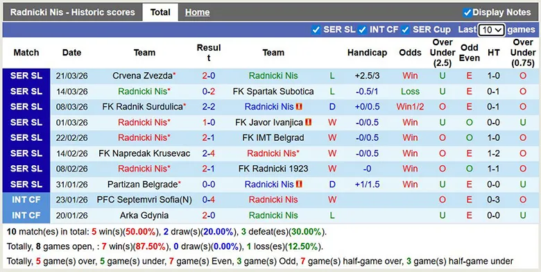 – Thống kê phong độ 10 trận gần nhất của Radnicki Nis