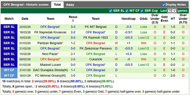 – Thống kê phong độ 10 trận gần nhất của OFK Beograd