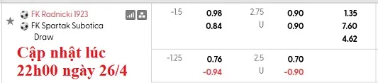 Radnicki được đánh giá vượt trội trong trận đấu này với kèo chấp lên tới 1 1/2. Đội khách thực sự đang thi đấu rất kém, thể hiện rõ qua việc họ đã thua kèo châu Á trong 5/6 trận gần nhất tại giải đấu hàng đầu Serbia.