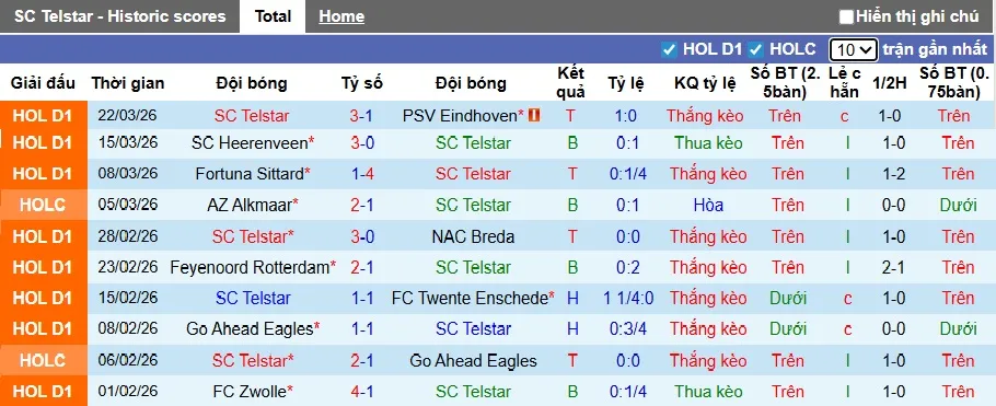 Tại sàn giao dịch châu Á, mức kèo được ghi nhận là 0:0, tỷ lệ mà Telstar đã có thành tích rất tốt khi trong 2 trận gần nhất tại mức kèo này, họ đều giành chiến thắng, và cả 2 trận đều diễn ra trên sân nhà. Nếu nhìn xa hơn, Telstar đang có thành tích thắng kèo châu Á 7, hòa 1 và chỉ thua 1 trong 9 trận gần đây.