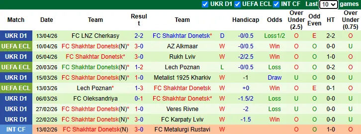 Thống kê phong độ 10 trận gần nhất của Shakhtar Donetsk