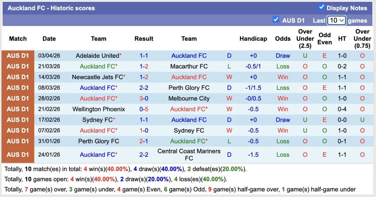 – Thống kê phong độ 10 trận gần nhất của Auckland