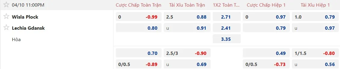 Tại sàn giao dịch châu Á, mức kèo được niêm yết là 0:0, một tỷ lệ mà 3 trận đối đầu gần nhất giữa hai đội đều xuất hiện. Thành tích đối đầu khá cân bằng khi mỗi đội có 1 chiến thắng và trận lượt đi hồi tháng 10/2025 kết thúc mà không có đội nào giành được chiến thắng. Phong độ hiện tại của Wisla Plock đang rất kém khi thua kèo 6/8 trận gần đây, trong khi Lechia Gdansk lại có phong độ tốt hơn với 3/4 trận gần nhất thắng kèo, trong đó có 1 trận cũng có kèo châu Á 0:0.