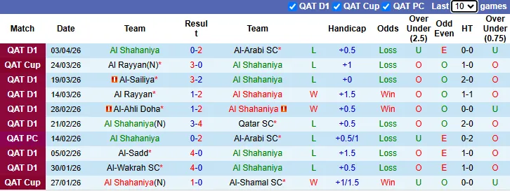 Thống kê phong độ 10 trận gần nhất của Al Shahaniya