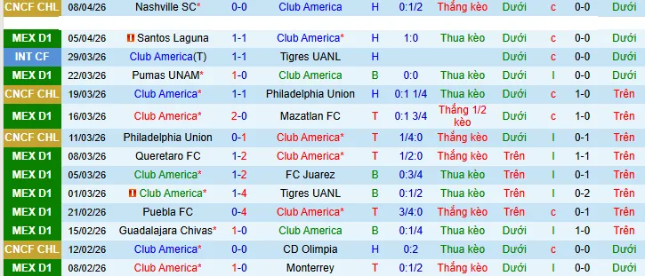 + Club America thua 3/4 trận chính thức gần đây theo kèo châu Á.