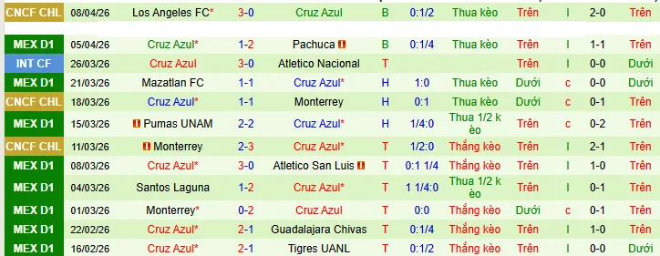 + Cruz Azul đã vượt qua mức chấp +0.25 trong 9/10 trận gần đây nhất của họ.