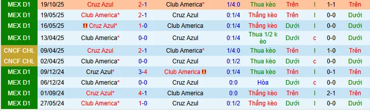 + Club America thắng 3, hòa 1 và thua 6 trong 10 trận đối đầu gần nhất với Cruz Azul theo kèo châu Á.