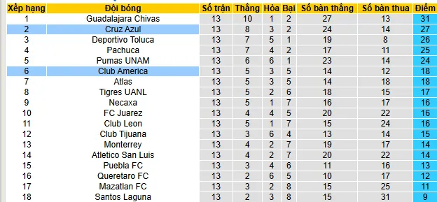 + Club America thắng 5, thua 4 và hòa 1 trong 10 trận gần đây ở giải VĐQG.