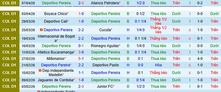 Về thành tích đối đầu, Pereira cũng gặp khó khăn trước Once Caldas, chỉ giành được một chiến thắng trong năm cuộc đối đầu gần nhất (1 thắng, 1 hòa, 3 thua), với trung bình 0,8 bàn thắng và 1,4 bàn thua mỗi trận. Cuộc chạm trán gần nhất kết thúc với tỷ số 1-0 vào ngày 6 tháng 9 năm 2025, một lần nữa phản ánh sự hạn chế trong tấn công của họ.