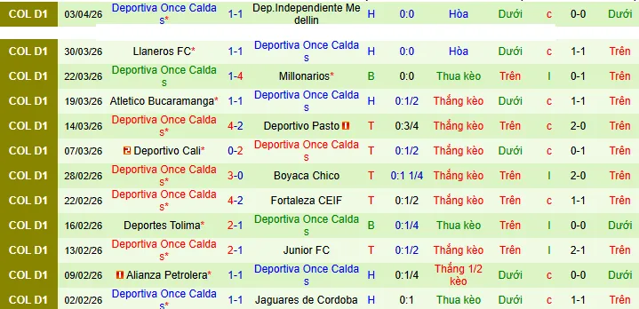 + Once Caldas có 1 trận thua, 2 trận hòa và 5 trận thắng trong 8 trận gần đây theo kèo châu Á.