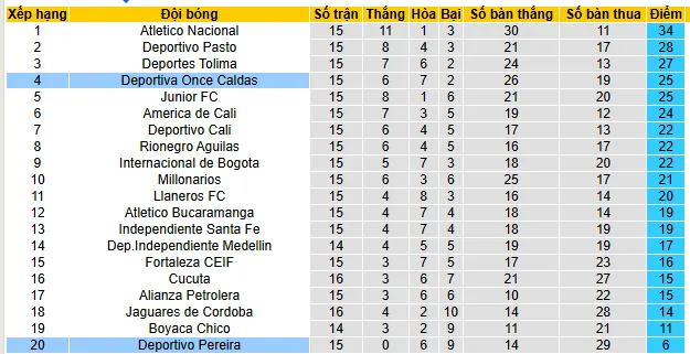 Caldas bước vào trận đấu này với vị trí thứ tư trên bảng xếp hạng, có được 25 điểm sau 15 vòng đấu, thể hiện phong độ tốt và cạnh tranh hơn hẳn. Đội khách chỉ thua một trong tám trận gần nhất ở giải VĐQG, cho thấy sự ổn định và khả năng phục hồi đáng kể.