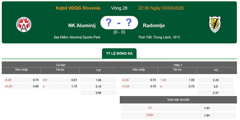 Soi kèo tài xỉu NK Aluminij vs NK Radomlje