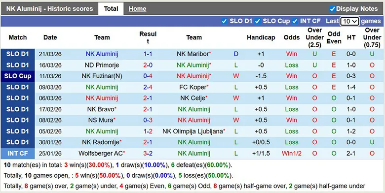 – Thống kê phong độ 10 trận đấu gần nhất của NK Aluminij
