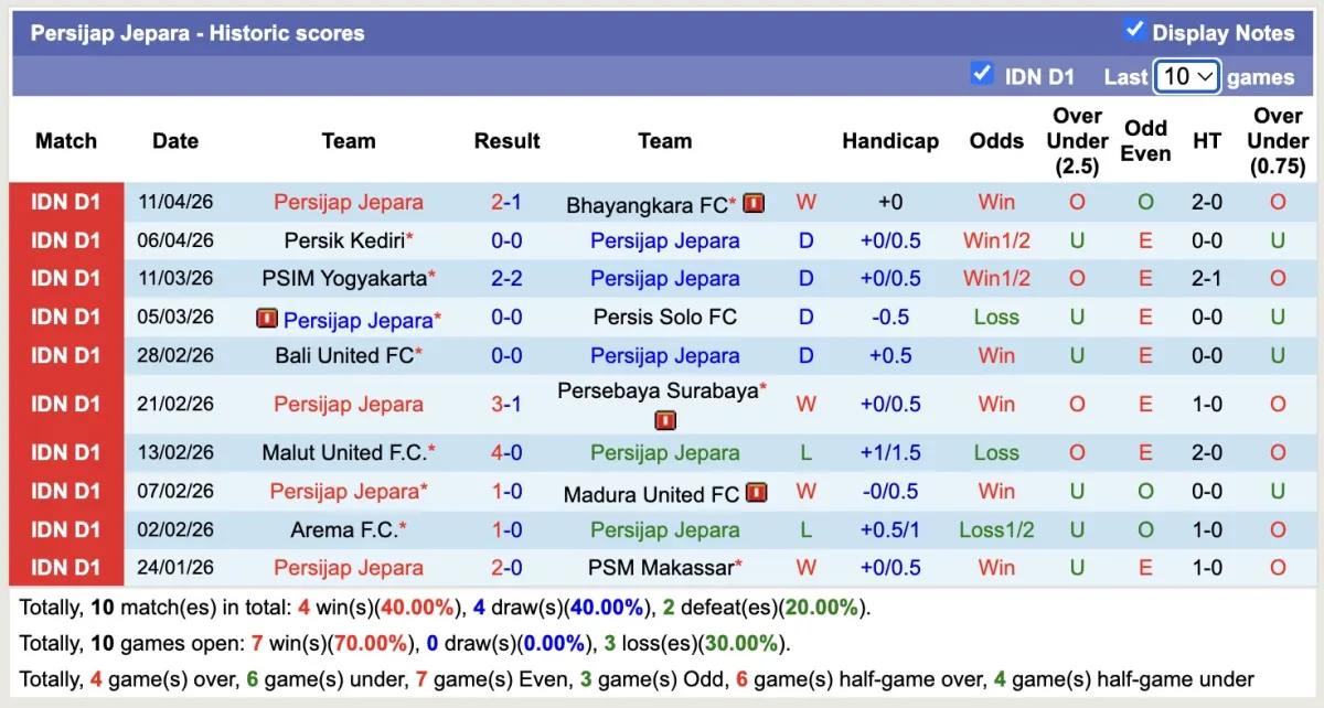 -Thống kê phong độ 10 trận đấu gần nhất của Persijap Jepara