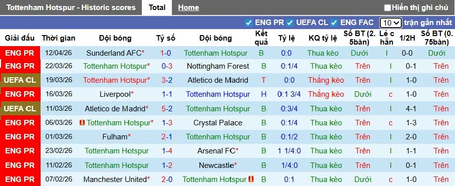 Phong độ kém cỏi đã khiến Tottenham chỉ kiếm được 1 điểm trong 9 trận gần nhất tại giải Ngoại hạng Anh, và họ chưa giành được chiến thắng nào kể từ trận thắng 1-0 trước Crystal Palace vào ngày 29/12/2025. Spurs cũng đã thua 10 trận và chỉ có 2 chiến thắng trong 16 trận đấu trên sân nhà ở mùa giải này, đây là thành tích tệ nhất trong giải đấu.
