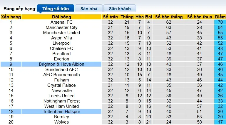 Thống kê phong độ, lịch sử đối đầu của Tottenham vs Brighton