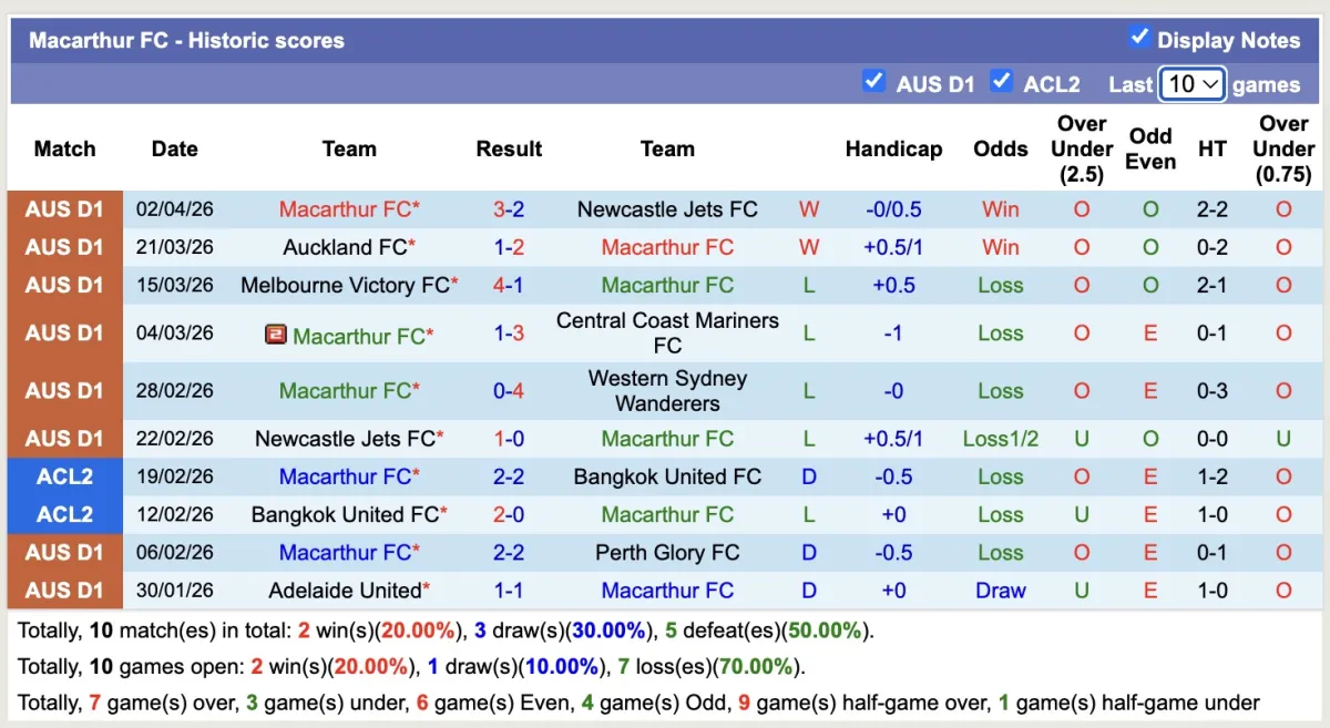 – Thống kê phong độ 10 trận đấu gần nhất của Macarthur