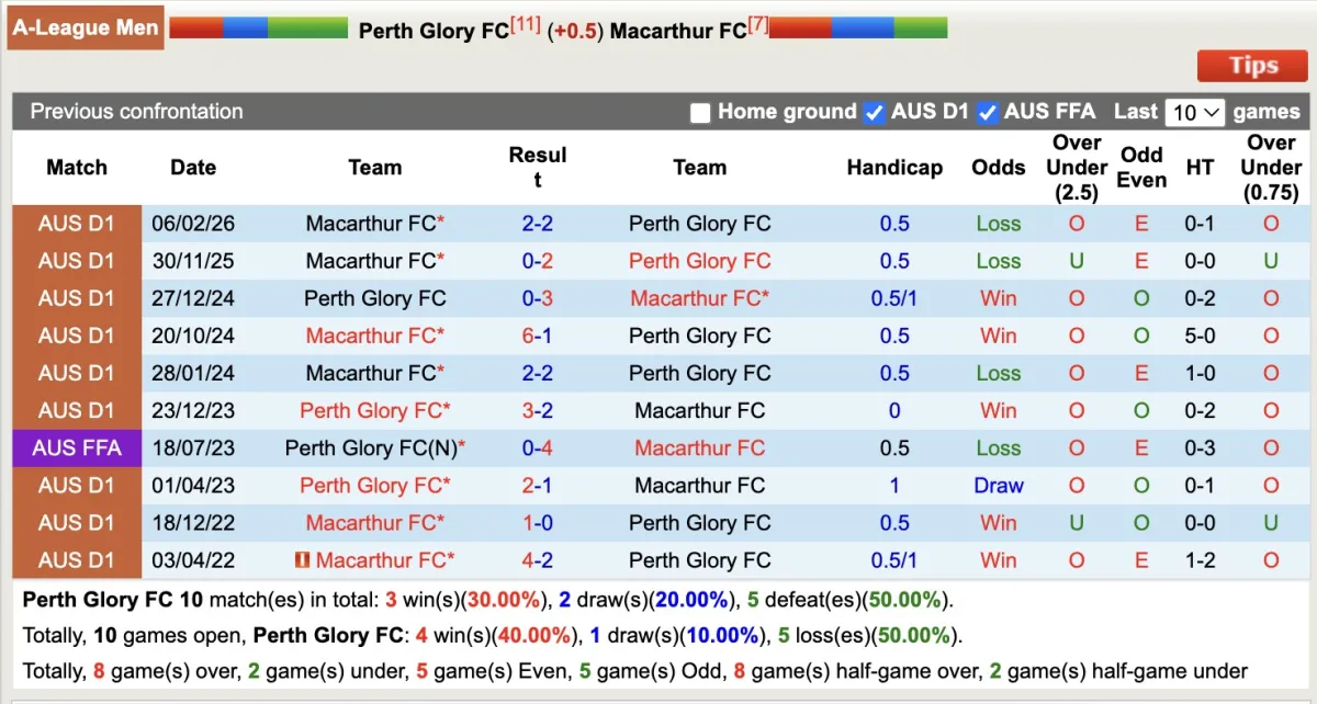 Trong lần đối đầu gần nhất giữa hai đội vào tháng 2 năm 2026, Macarthur dù được đánh giá cao hơn nhưng đã không thể thắng kèo. Trong 4/5 trận gần đây tại sân nhà, đội bóng này cũng không thể vượt qua được mức Handicap. Có vẻ như Perth Glory là sự lựa chọn an toàn hơn.