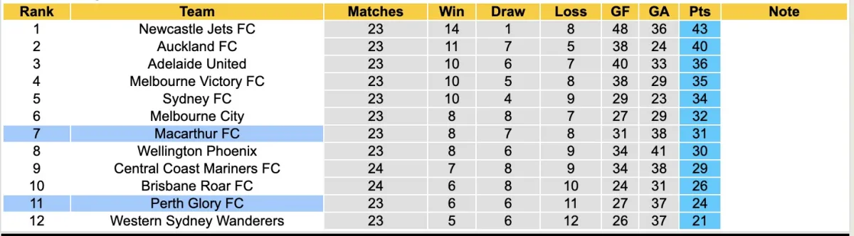 Thành tích của Perth Glory trong mùa giải này thực sự làm các cổ động viên cảm thấy chán nản. Sau 23 vòng đấu tại giải VĐQG Úc, đội bóng này chỉ có được 6 chiến thắng và 11 thất bại, hiện đang đứng ở vị trí thứ 11 trên tổng số 12 đội với 24 điểm.