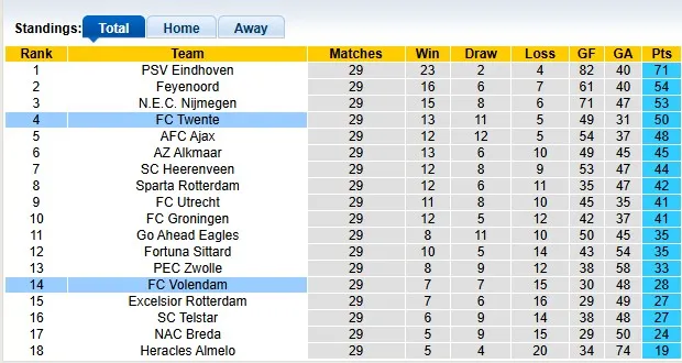 Thống kê phong độ, lịch sử đối đầu của Twente đấu vs Volendam