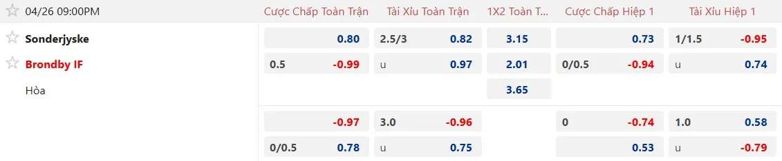 Tại sân nhà của mình, Sonderjyske đang thể hiện phong độ khá ổn định với việc thắng kèo châu Á trong 4/5 trận gần đây. Đối với Brondby, đội bóng này đã thua kèo trong 5/8 trận sân khách gần nhất, trong đó có 1 trận cũng chấp 1/4 trái như trận này.
