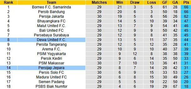 Hiện tại, Dewa United đang giữ vững vị trí trong nhóm nửa trên bảng xếp hạng (hạng 8, 44 điểm). Đội chủ nhà có một đội hình chất lượng với những ngôi sao tấn công như Alex Martins, Stefano Lilipaly và Alexis Messidoro. Phong độ ghi bàn của Dewa United thực sự ấn tượng với 6 trận bất bại liên tiếp (thắng 3, hòa 3).