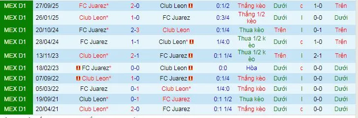 Trong lần chạm trán gần nhất, FC Juarez đã giành chiến thắng ấn tượng 2-0 trước Leon. Trong 5 lần gặp nhau gần đây, Leon thắng 3 lần, trong khi FC Juarez chỉ thắng 1 lần và có 1 trận hòa.