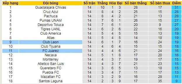 Sau 14 trận đấu, Leon hiện đang xếp thứ 9 với 19 điểm, bao gồm 6 chiến thắng, 1 trận hòa và 7 thất bại trong mùa Clausura này. Trong khi đó, FC Juarez đứng ở vị trí thứ 11 với 16 điểm, có được 4 chiến thắng, 4 trận hòa và 6 thất bại. Với phong độ hiện tại và lịch sử đối đầu, trận đấu này hứa hẹn sẽ rất kịch tính.