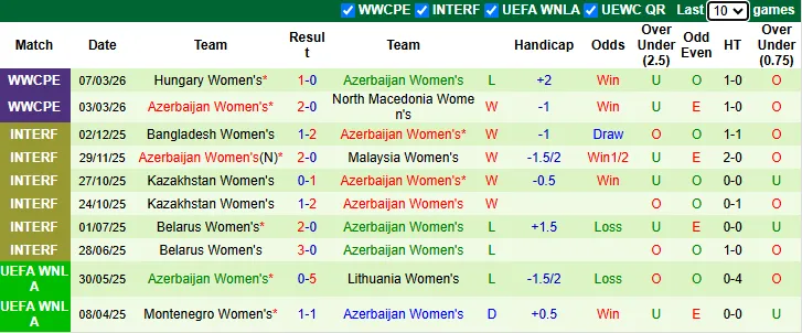 Thống kê phong độ 10 trận gần nhất của Nữ Azerbaijan