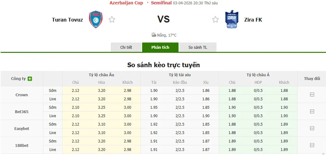Turan Tovuz đã bất bại trong 4/6 cuộc đối đầu gần đây với Zira. Họ đã giành 7 chiến thắng và hòa 3 trong 10 trận gần nhất ở mọi đấu trường. Zira không thắng trong 2/3 trận gần đây, điều này khiến giới đầu tư châu Âu trở nên dè chừng.