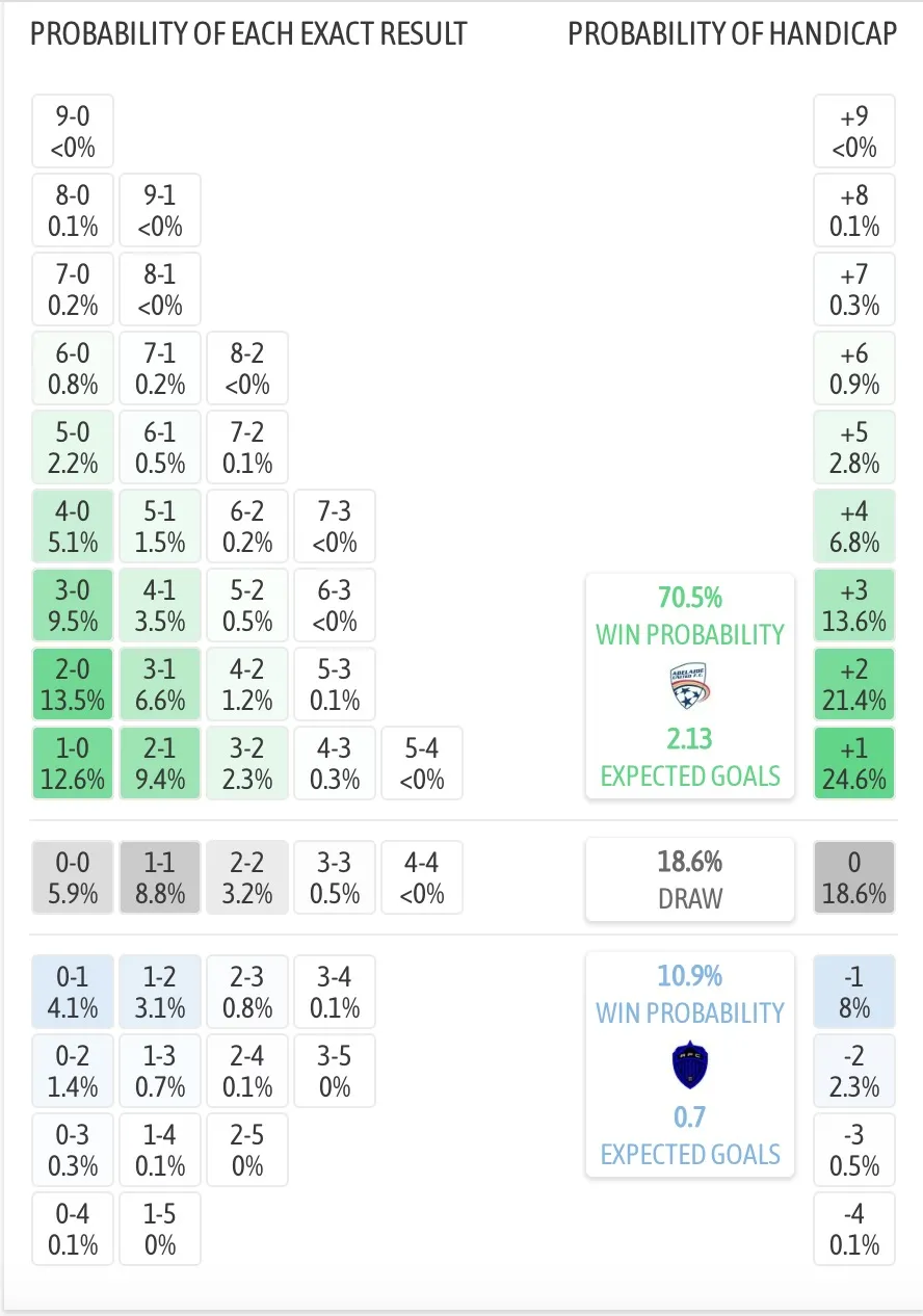 Phía đối diện, tỷ số thắng 1-0 của Auckland là cao nhất với 4.1%. Sau đó đến 2-1 với 3.1% và 2-0 với 1.4%. Trong nhóm tỷ số hòa, 1-1 có cơ sở nhất với xác suất lên đến 8.8%.