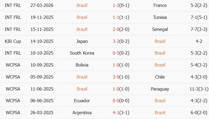 Thống kê phong độ 10 trận đấu gần nhất của Brazil