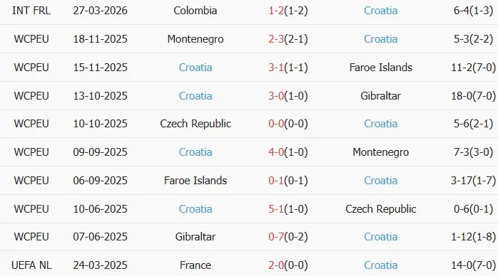 Thống kê phong độ 10 trận đấu gần nhất của Croatia