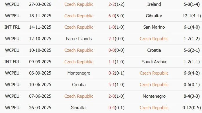 Thống kê phong độ 10 trận đấu gần nhất của CH Séc