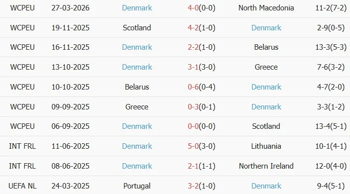 Thống kê phong độ 10 trận đấu gần nhất của Đan Mạch