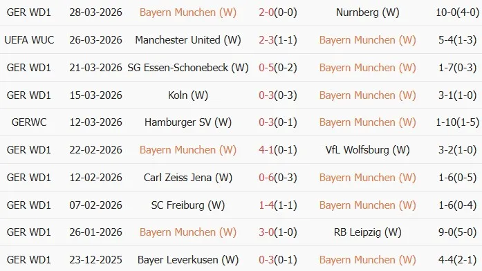 Thống kê phong độ 10 trận đấu gần nhất của Nữ Bayern