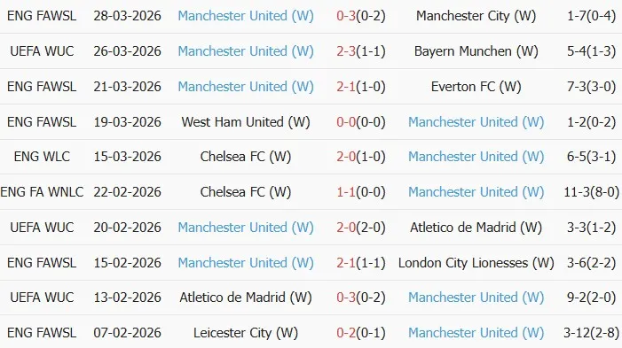 Thống kê phong độ 10 trận đấu gần nhất của Nữ MU