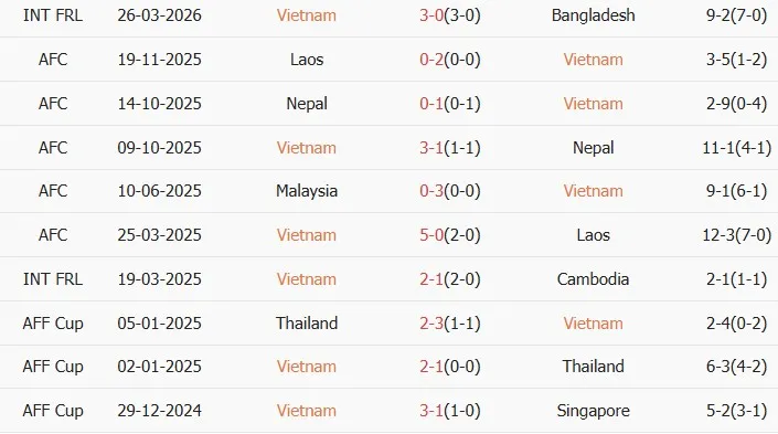 Thống kê phong độ 10 trận đấu gần nhất của Việt Nam