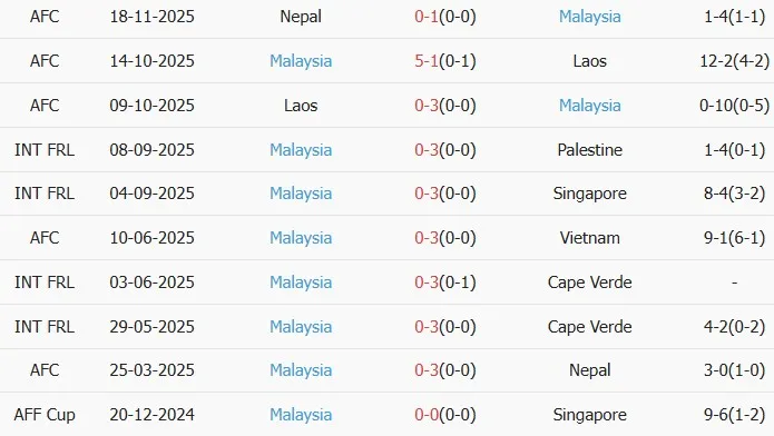 Thống kê phong độ 10 trận đấu gần nhất của Malaysia