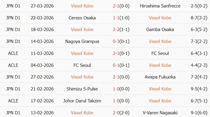 Thống kê phong độ 10 trận đấu gần nhất của Vissel Kobe