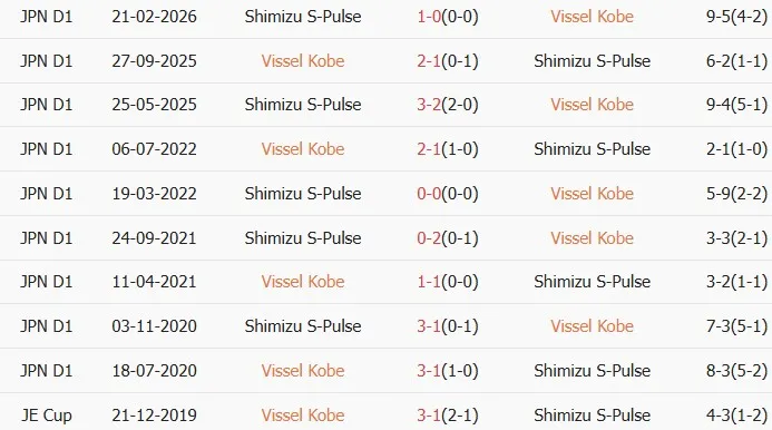 Lịch sử đối đầu Vissel Kobe vs Shimizu S-Pulse