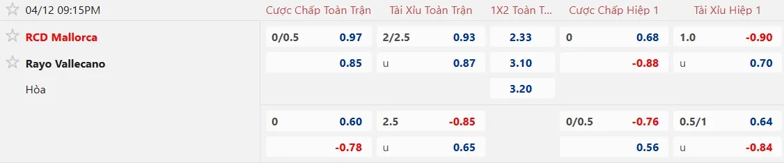 Trên sàn giao dịch châu Á, Mallorca được đánh giá chấp 1/4 trái, một tỷ lệ đã xuất hiện trong trận đối đầu gần nhất khi họ thắng Vallecano trên sân nhà. Phong độ hiện tại của Mallorca cũng rất ấn tượng, khi họ đã thắng kèo châu Á 3/4 trận gần đây, trong đó có một trận cũng chấp 1/4 trái.